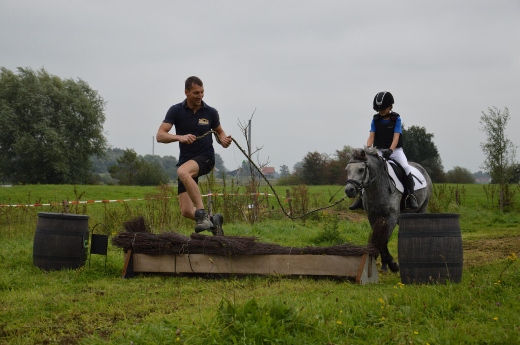 En hoewel we het hebben uitgezet voor de jeugdruiters, mogen ook de paarden snuffelen aan de cross. En zeker voor jonge paarden of onzekere ruiters is dit parcours een aanwinst.